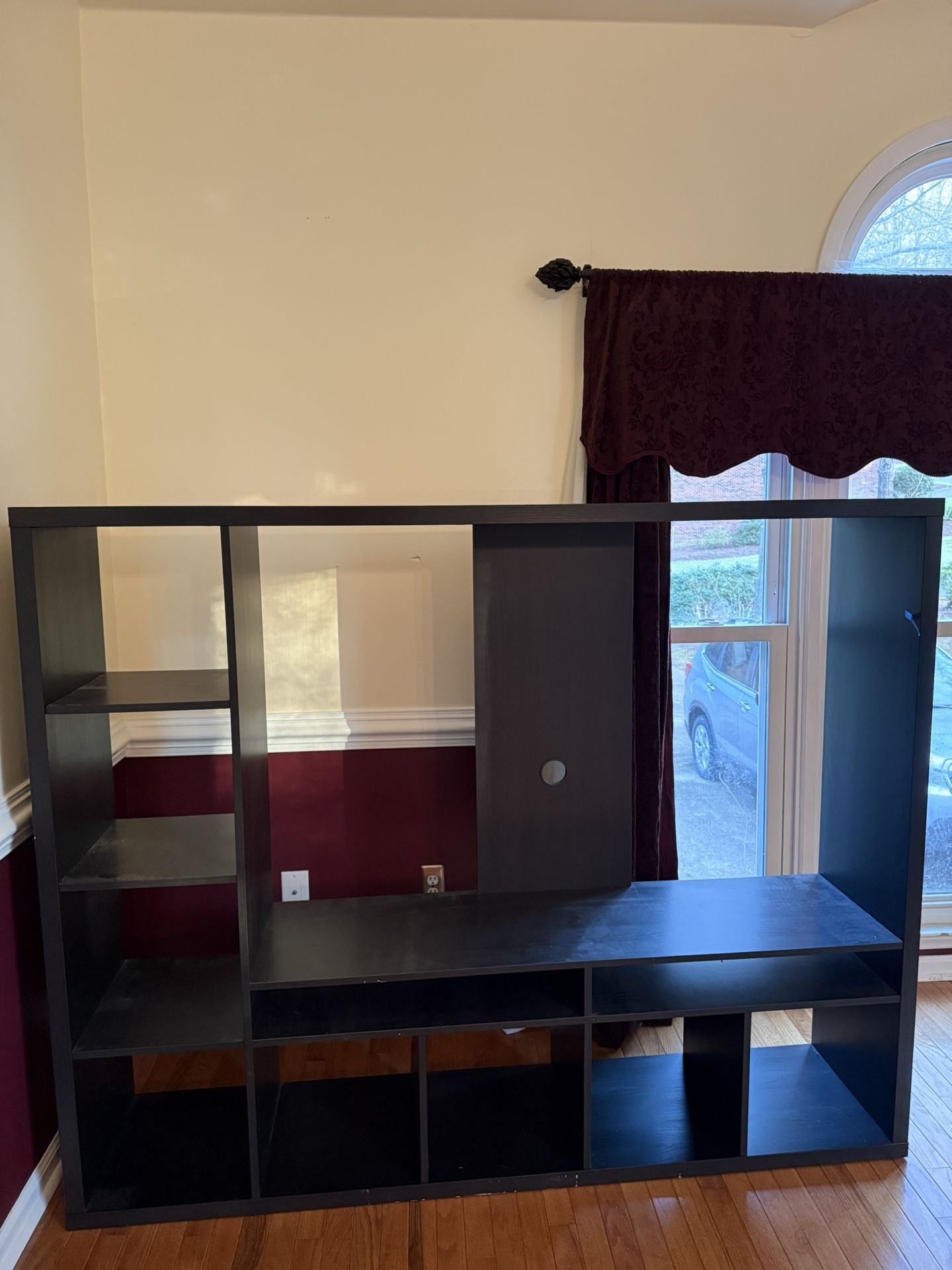 • A large open center space for a TV • Storage cubbies underneath • Tall shelving towers on the sides • A central mounting panel with a cable-management hole Still in great condition and sturdy $30
