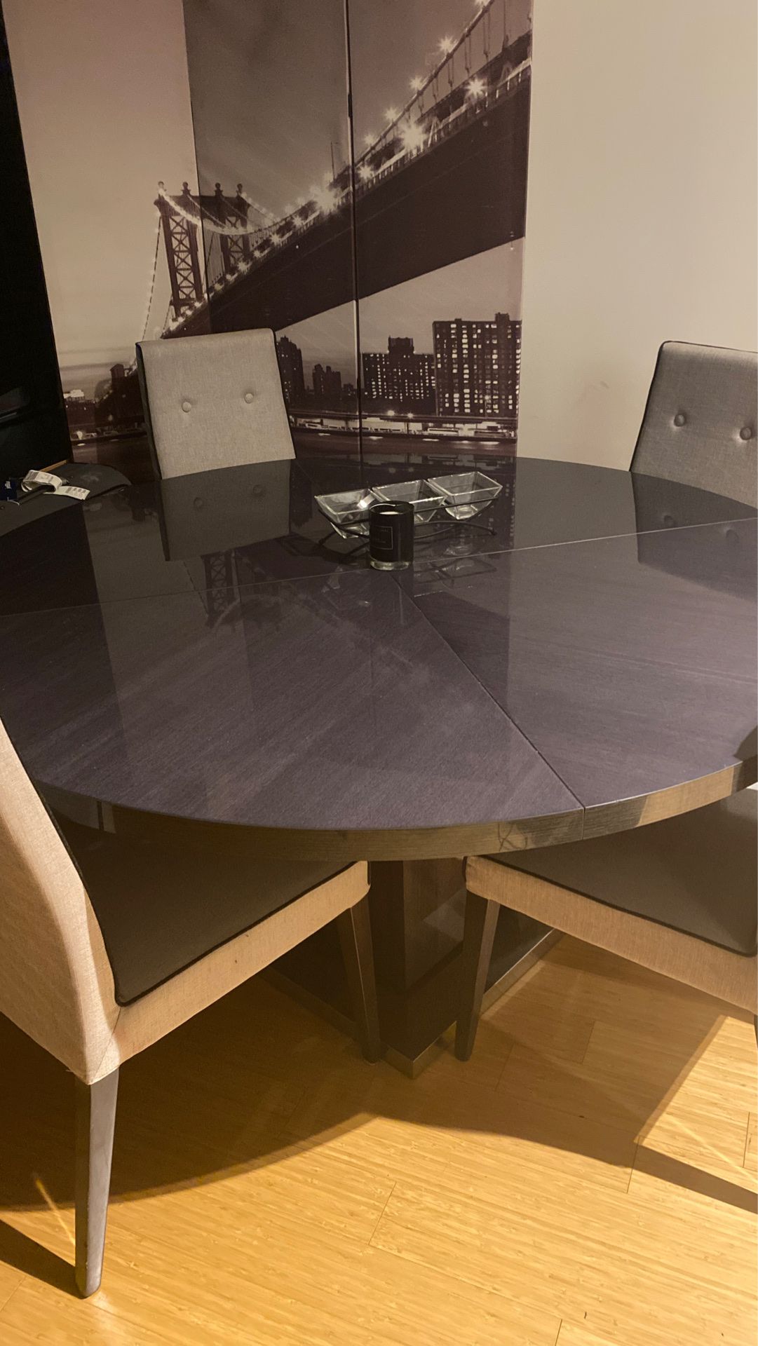 Selling all my furniture moving sale kitchen table, 4 chairs , sectional , cow hair rug , glass coffee table