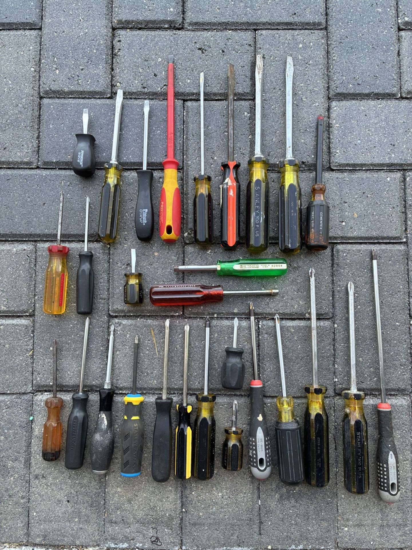 28 various brands including Stanley, Pittsburgh, BelZer, PROTO, s-k, etc slotted and Phillips head screwdrivers. Mixed condition