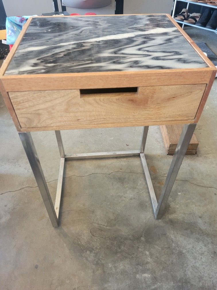 This Accent Table is Marble on top which is black, grey and white surrounded by wood and has a wood drawer in the front. The bottom of the table is silver metal. I love the look of this piece and it is really kind of classy. It is in really good condition.