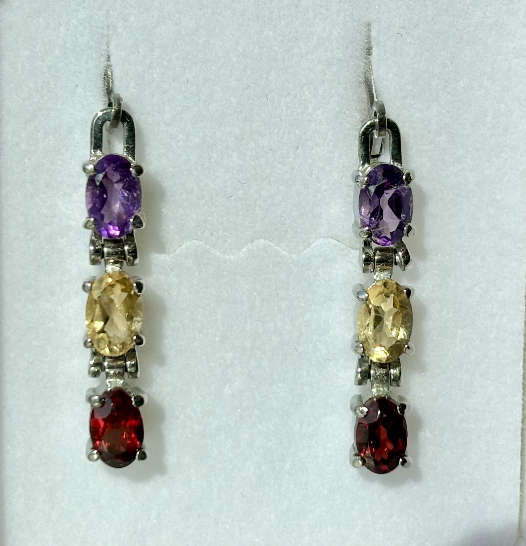 Brand new, lovely multi gemstone dangle earrings with lever back, set in tarnish free jewelry grade 316L stainless steel. Gemstones are garnet, amethyst and citrine. $10. I am in Miller Place, NY but can ship for a small fee. Thank you for looking.
