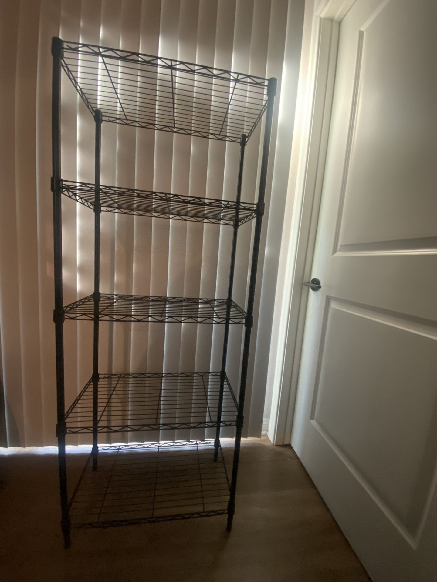 Black Metal 5 Tier Storage Shelving Unit Perfect for organizing — can be used to store boxes, plastic bins, crafts, laundry room supplies, kitchen or pantry items, tools, miscellaneous garage clutter, etc.! Product was assembled, but is otherwise in LIKE NEW condition. Will be disassembled for ease of transport — all the original parts are there, including the printed Assembly Instructions & spare connector pieces. Durable steel construction with black coated chrome finish. Adjustable leveling feet. Each shelf can support up to 200 lbs. Total max weight load is 1000 lbs. The shelves are adjustable and can be moved up or down in 1” increments. Assembly is simple and is easily accomplished by one person with no tools required. Assembled Product Measurements: 13.4" D x 23.2"W x 60"H Retails for $45. Priced to sell at $40.