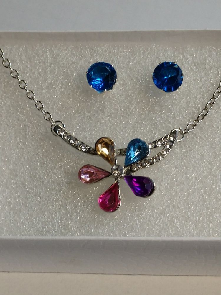 Cute Spring Flower Look Pendant Necklace with Earrings. Silver chain