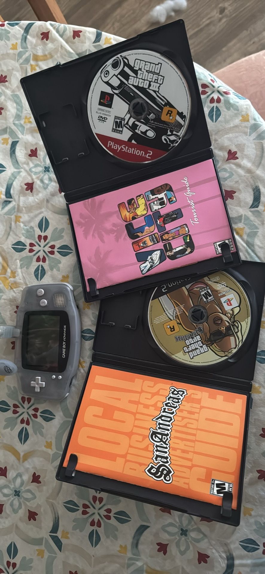 $40-Gameboy advance works flawlessly $15- GTA San Andreas $15- GTA Vice City