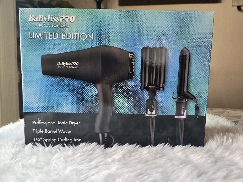 Baylisspro porcelain ceramic set .limited edition styling set. Brand new. Inside, there are 3 hair tools a professional soft touch ionic dryer,1 1/4 spring curling iron, and a triple barrel 1" 3/4" 1". I'm asking $175.