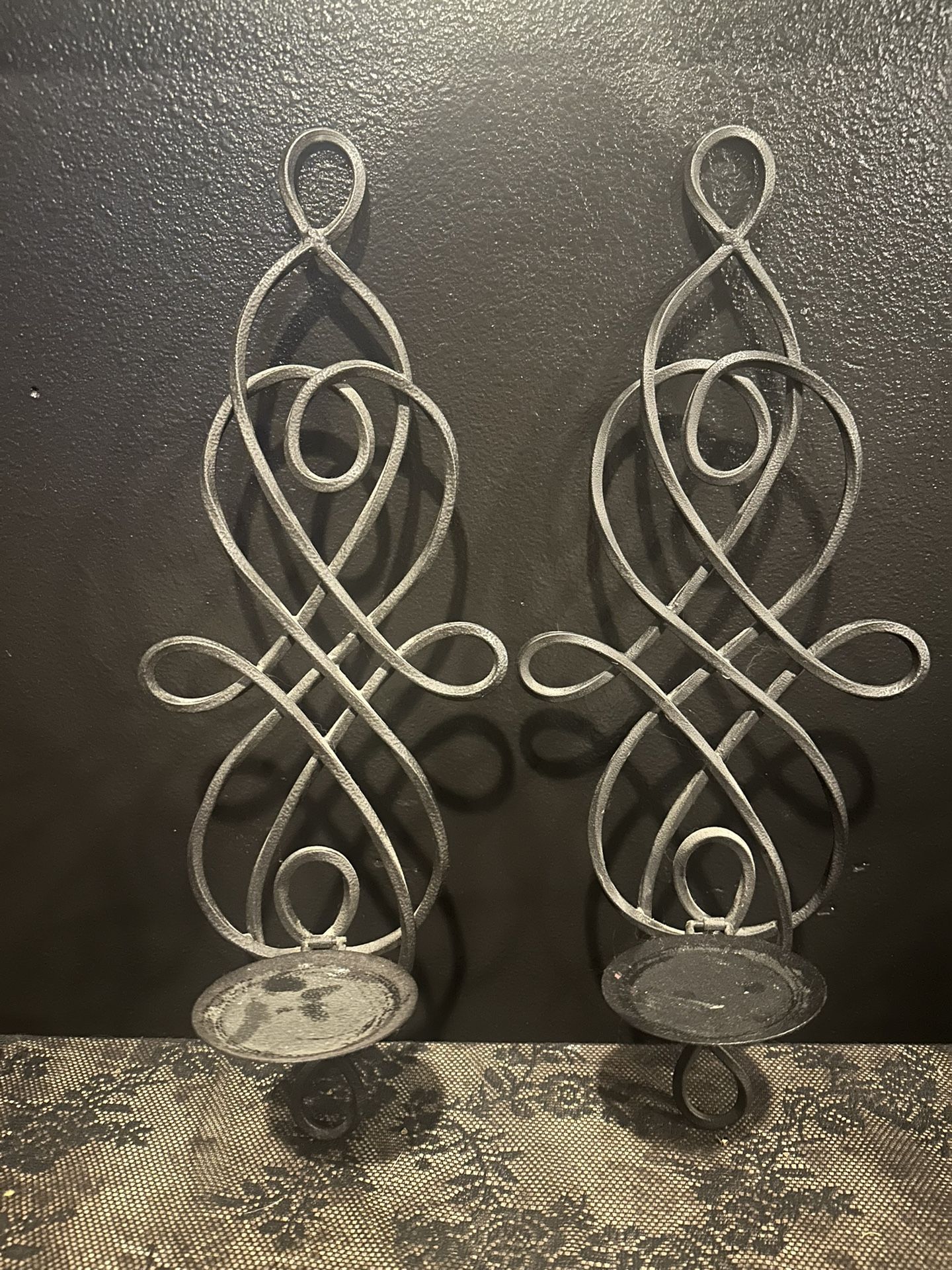Pair of wrought iron candle holders, approx. 8" wide and 18” tall. Metal wall decor #home #cottagecore #decor