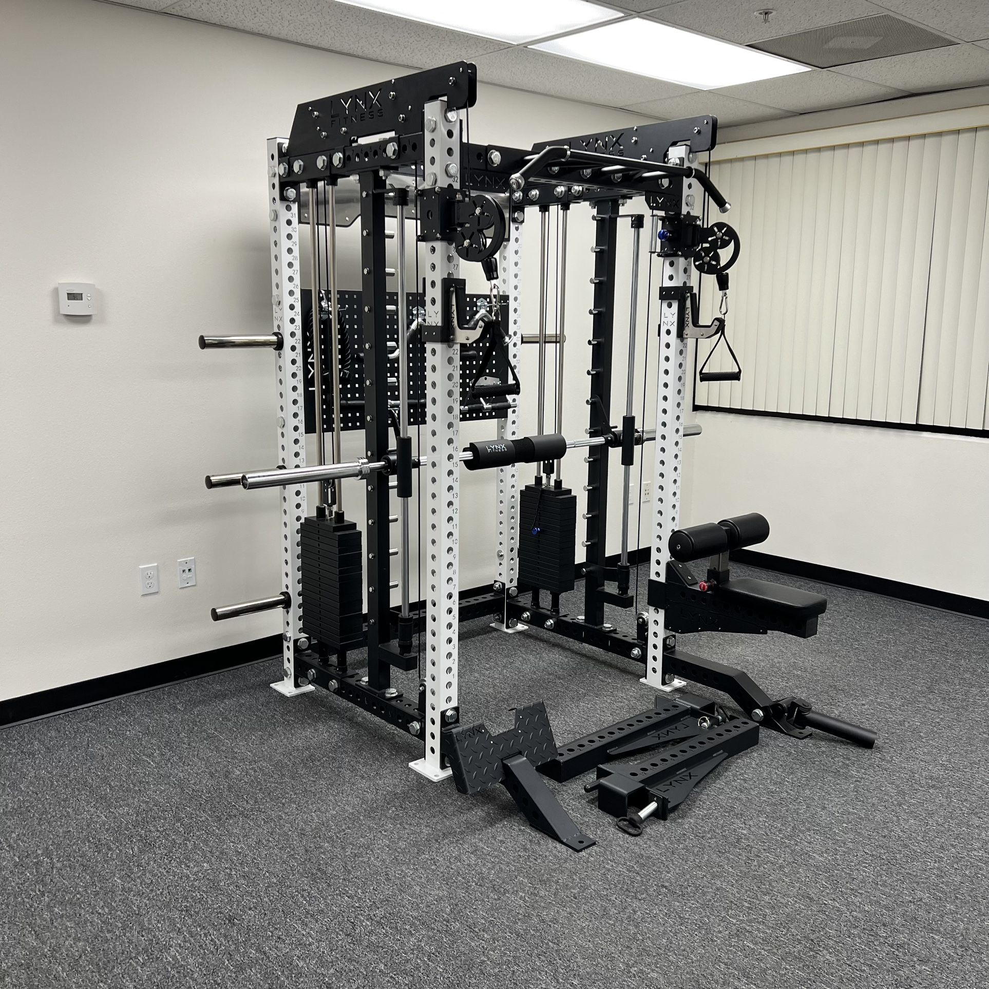 Our products include All-In-One Gym, Squat Bench Rack, Cable & Smith machines, Adjustable Dumbbells, Benches, Olympic Bar Barbell, Bumper Plates, Weights, Home Fitness Exercise Equipment, Attachments ‼️Set up an appointment to visit our showroom and see all of our products on display‼️ Everything pictured is included‼️ More pictures are available upon request! 🚚 FREE DELIVERY 🚚 This is a great space saving machine for any Commercial or Home Gym * Great for home gyms or commercial facilities! Available in ✅White ✅Clear coat (silver) ✅All black ✅Red Includes 🔴 Pair of J-cups 🔴 Pair of Safety spotter arms 🔴 Multi grip pull up bar 🔴 6 weight plate storage horns 🔴 7ft 45lb Olympic smith barbell w/ bearings 🔴 Commercial grade cables 🔴 Premium aluminum pulleys 🔴Front foot extensions for increased stability 🔴 Several attachments * Dip Bar * Lat pull down seat * Landmine * Foot plate * Peg board * Lat pull down V bar attachment * Tricep rope * Revolving straight bar * Pair of d handles * Single rope * Triangle row * V shaped cable attachment * Foam pad hip thrust squat pad 2:1 ratio pulley system Made from 11 gauge steel 3 x 3 inch posts Laser cut numbering and holes Heavy duty 1 inch hardware Heavy weight stacks 700lb weight capacity smith machine barbell Smooth pulley system Also selling more gym equipment on my profile. Message me for bundle