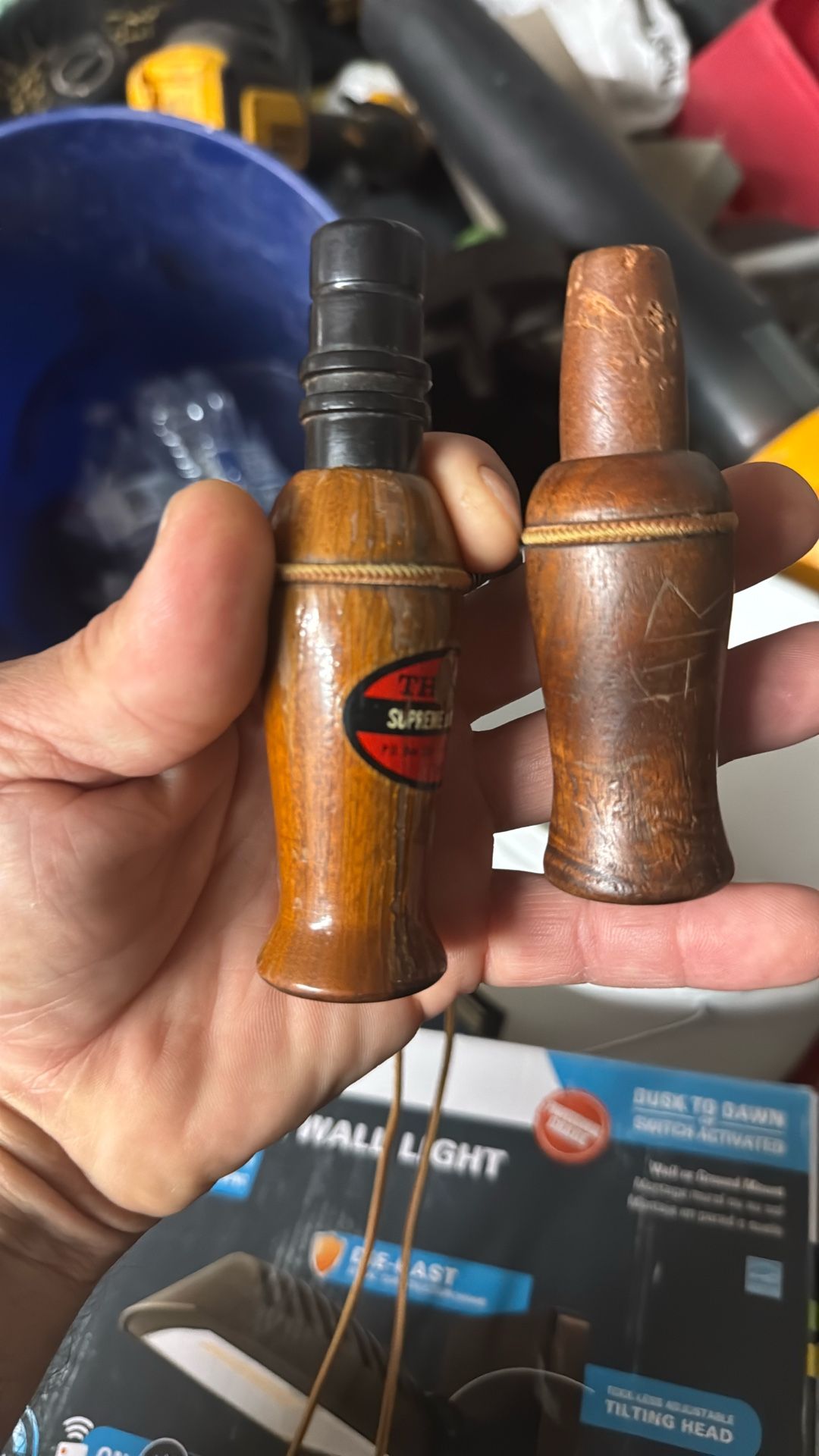 Two vintage duck calls on lanyard
