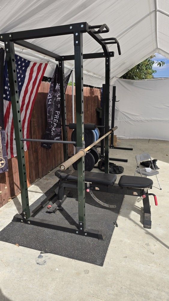 Gym set up with a power rack, rouge plates and bumper plates, rouge squat rack and barbell! Over 300lbs of weight!