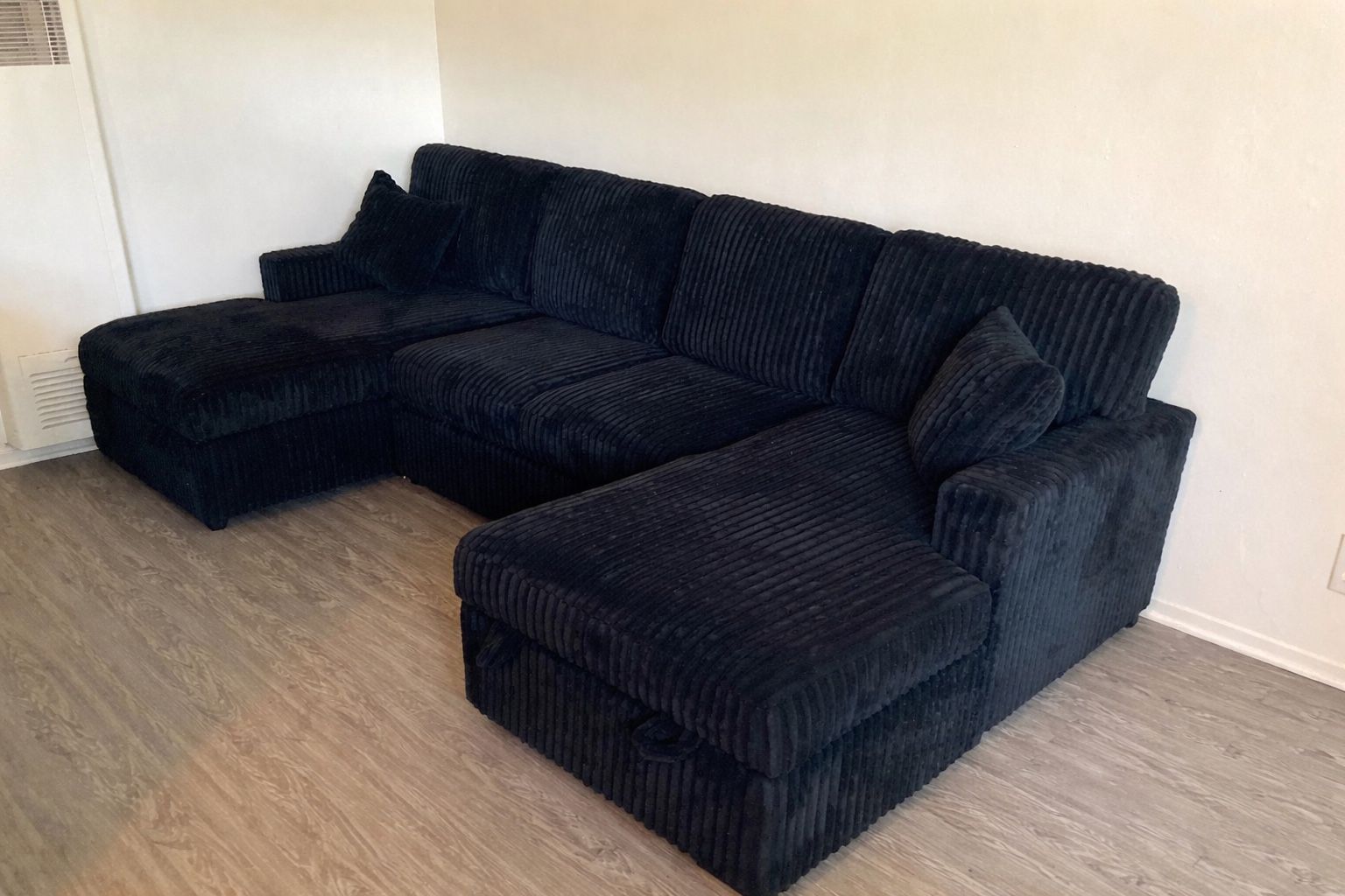 Brand new corduroy Sectional Sofa with double chaise and two accent pillows. Comes new in 2 boxes. Assembly required. 120x60x35h. colors available are black, ivory, and fog grey. Delivery π for additional fee. Firm price Grey Couch Gray Sectional U shape
