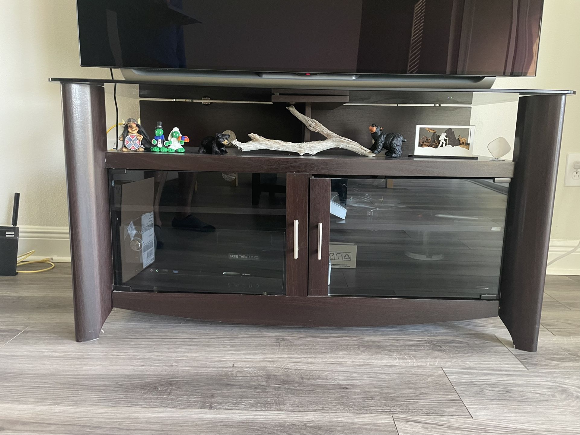 Wood/glass TV stand entertainment center with cabinet. Glass top and cabinet doors Length 46in Height 24in Width 22in