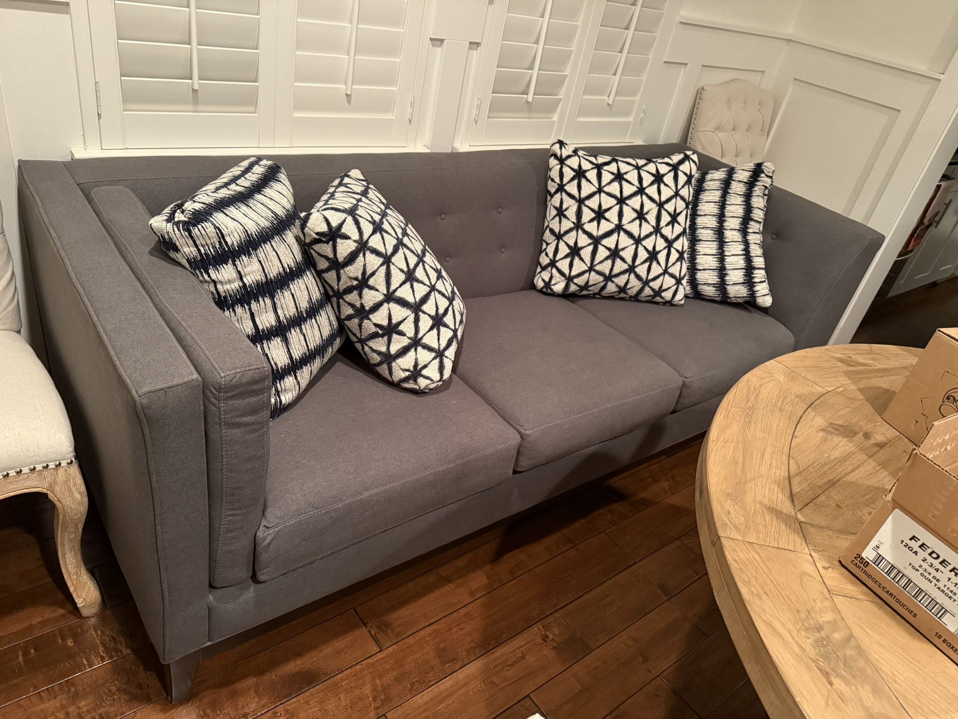 Selling a sofa we bought from Macy’s that has been very rarely used. It has been in our home office for aesthetics only. Excellent condition. Paid $1,400, selling for only $150. Only selling as we installed built ins to the office and no longer have room for this piece. It’s from the Braylei Collection by Jonathan Lewis. The color is Devon Pewter and dimensions are below. 92” Long 36” Deep 31” tall