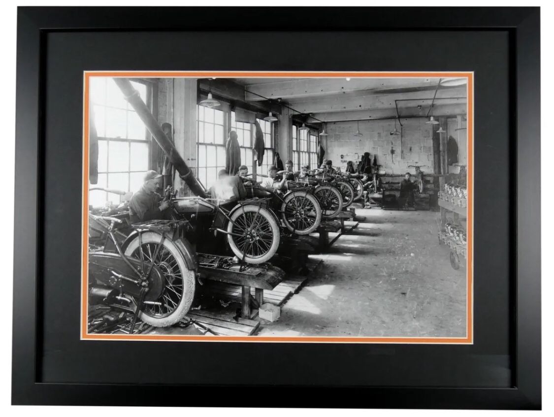 Featured is 1924 Harley-Davidson Original Factory framed 16x20 high quality photo. Brand new professional wood framing; featuring double matting (Harley Black & Orange) and the frame is ready for display. The frame measures approximately 26 (w) x 20 (h) in total size. Additional Features: The heritage of Harley-Davidson Model pictured in this photo. Photo taken in 1924 of the first Harley-Davidson factory. There is something unique built into every Harley-Davidson motorcycle. It's the dirt of every back road, the curve of every race track, the seat of every rider. It's the spirit of every Harley that came before, and the promise of every road that lies ahead.