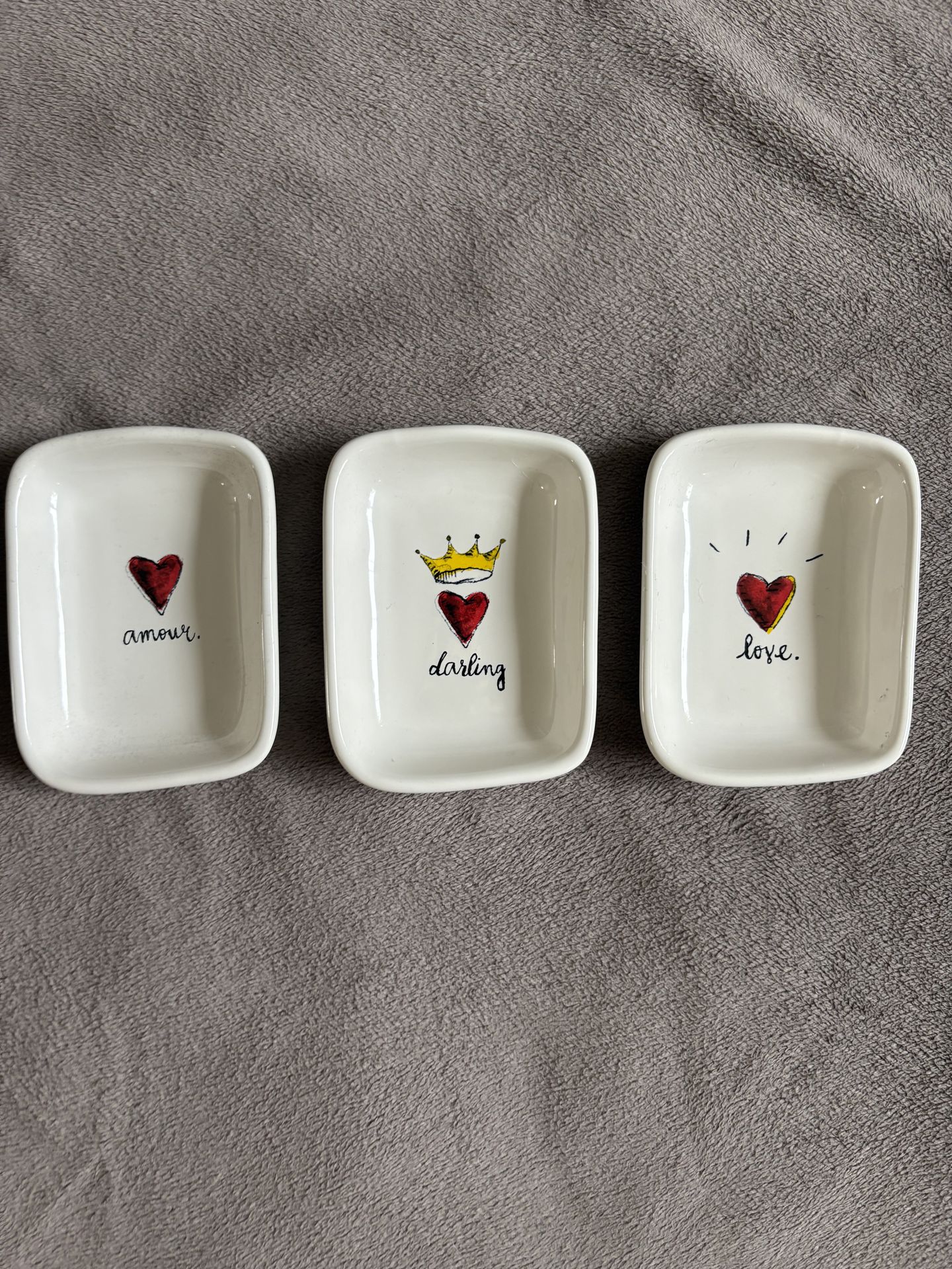 Rae Dunn Artisan Collection by Magenta Ceramic Heart Trays Set of 3, Love Theme Each tray is 4”x5” Used - good condition (was just used as decor) No chips/scratches $7 for set