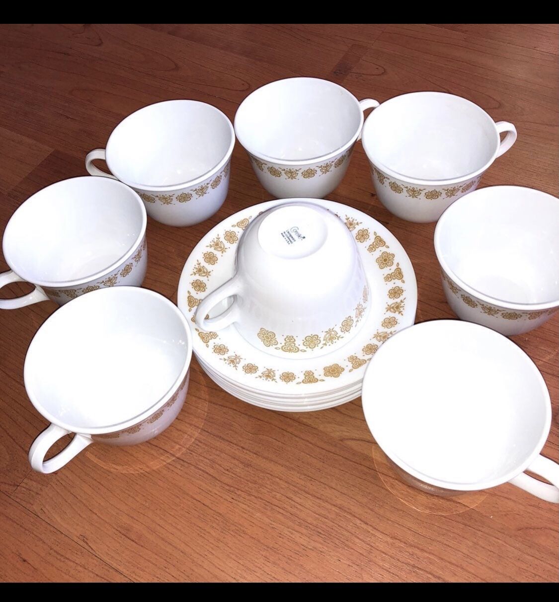 New and unused tea cups and saucer set. In great condition. No flaws. Floral prints on the edges. Made in U.S.A. Ready for pickup