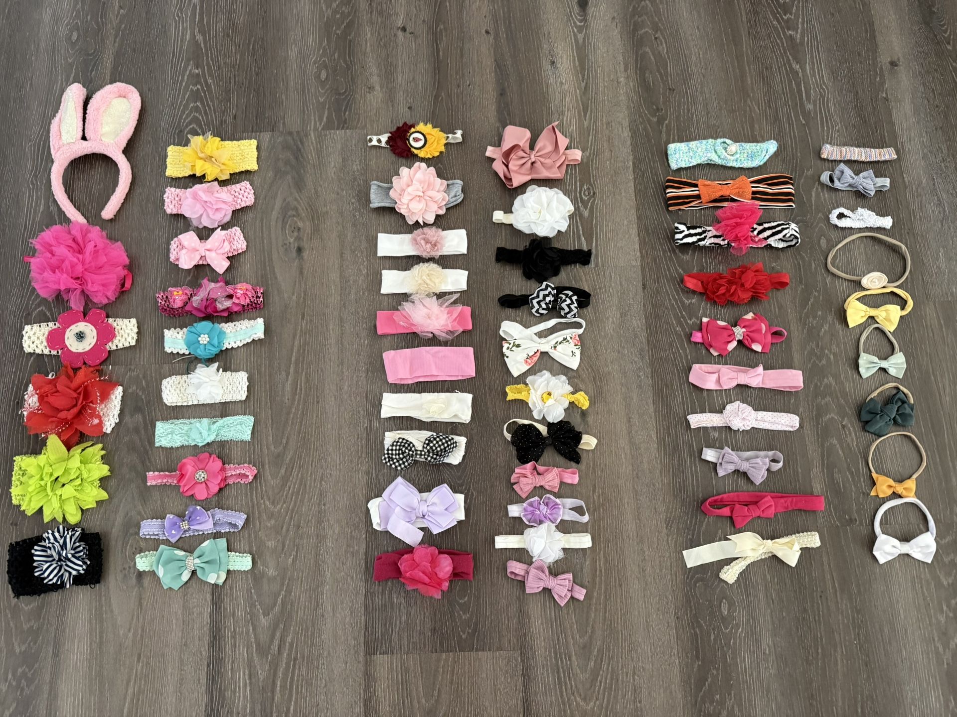 Baby girl hair bows , arranged by design . 56 pieces total for $25. Must take all, will hold for Venmo . Check my other listing: Also have lots of baby girl clothes 3-6m,3-9m,12-18m,24m/2t,4t/5t Also have baby hats,shoes, hairpins/head bows, socks , Velcro swaddle,bibs, mittens, car seat cover, nursing cover , baby carrier , sleeps sacks, rainbow mat,towels , burp clothes, etc.