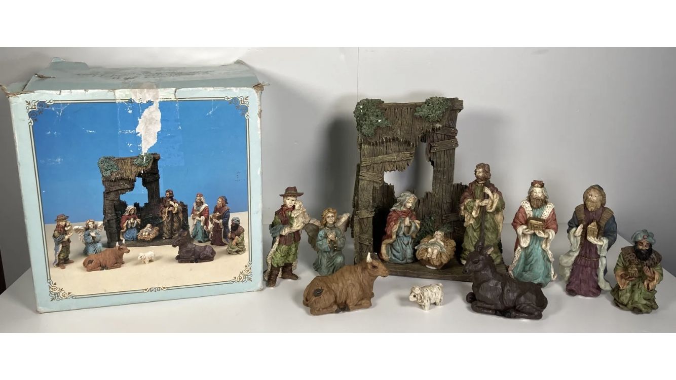 This is a very nice, Vintage Sears Nativity Set Hand carved wood-resin 10 Piece w/ Box 32 98506. The set is in excellent condition with minimal signs of wear. There are no broken or damaged parts. The box shows some wear as seen.