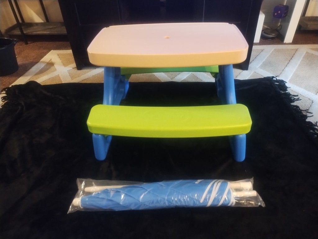 Selling brand new just assembled never used Little tikes picnic table and benches with umbrella asking $40