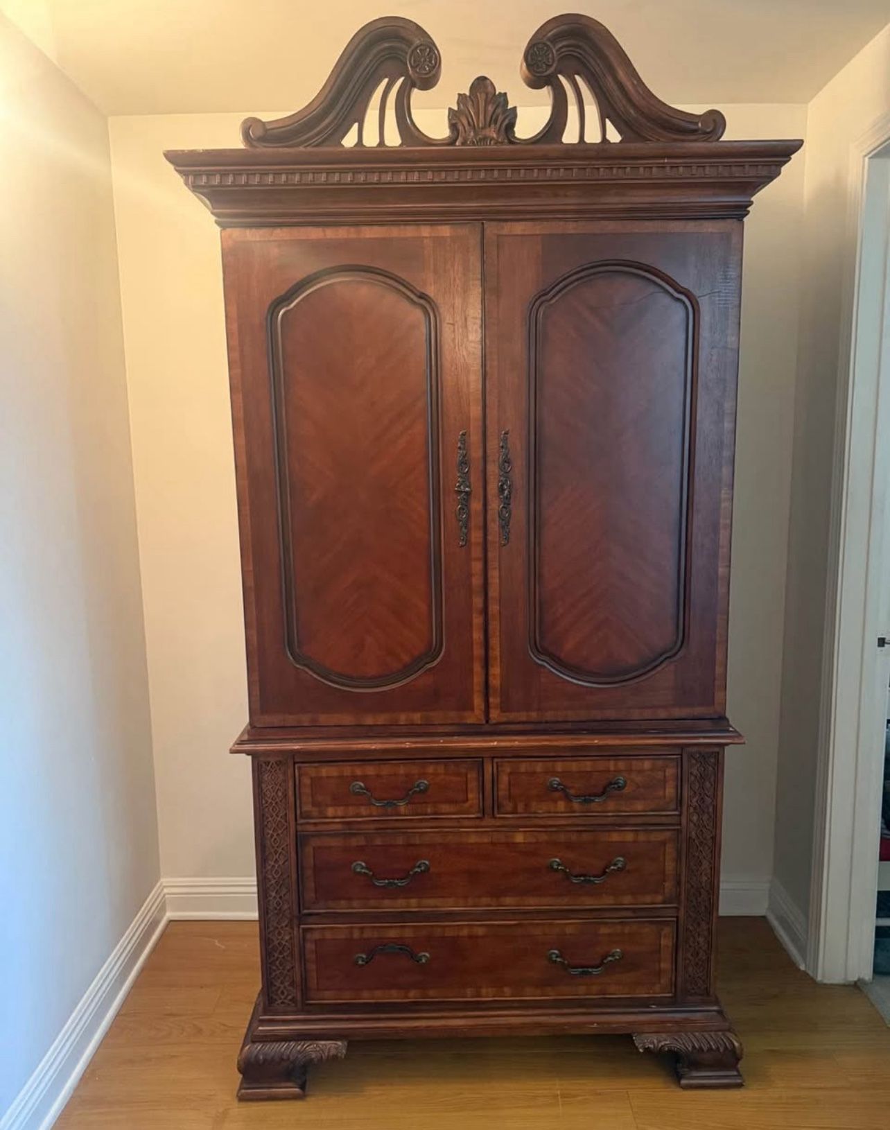 Ashley Millenium discontinued wood mahogany armoire. In amazing condition! Has two detachable sections, base with drawers and top part has shelves. The crown is removable. Third photo shows similar armoires currently on the market for 5,000-12,000! I have matching furniture available as well (see last photo) Pick up in Burbank 91501. I take venmo, zelle, and cash.