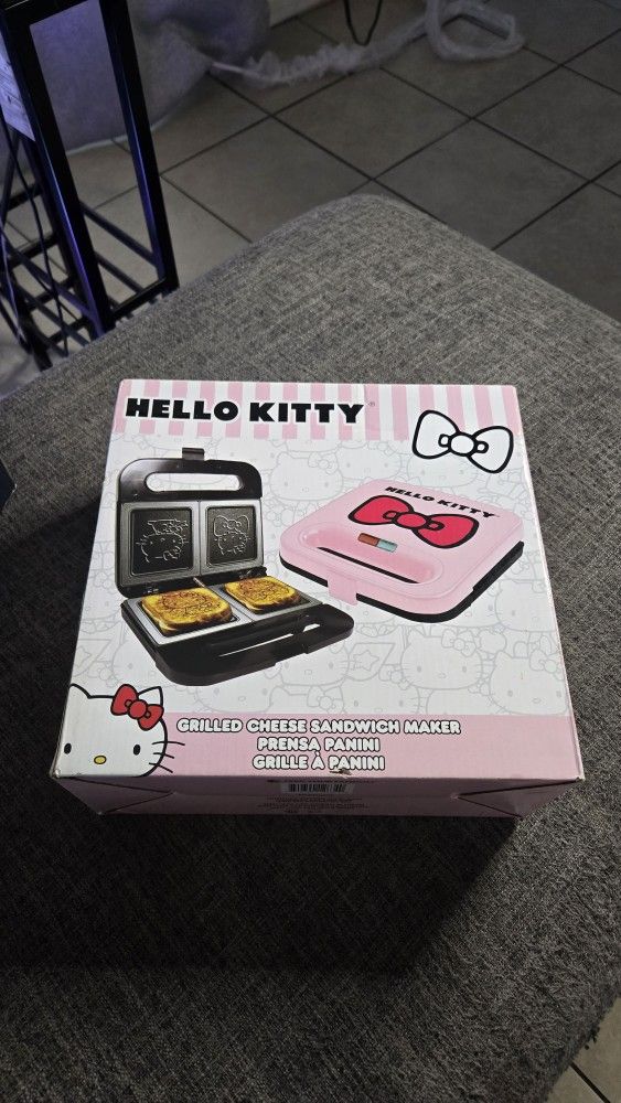 PERFECT FOR ANY SPACE - This grilled cheese maker not only makes two servings at once, its compact size is perfect for small countertops. CLASSIC HELLO KITTY DESIGN - The durable plates give you the best grilling and will put a silhouette of Hello Kitty and the iconic Hello Kitty bow on both sides of your pressed sandwich. NON-STICK COATING - Inner plates are durable, easy to clean, and reduce the need for butter and oil. MAKES A GREAT GIFT – Hello Kitty sandwiches are the perfect way to bring pop culture cheer to any hero's kitchen. NEW IN BOX NEVER OPENED!!!! Come grab it before its gone... ... This item retails 50$ online and in stores. .... ......Perfect Christmas gift