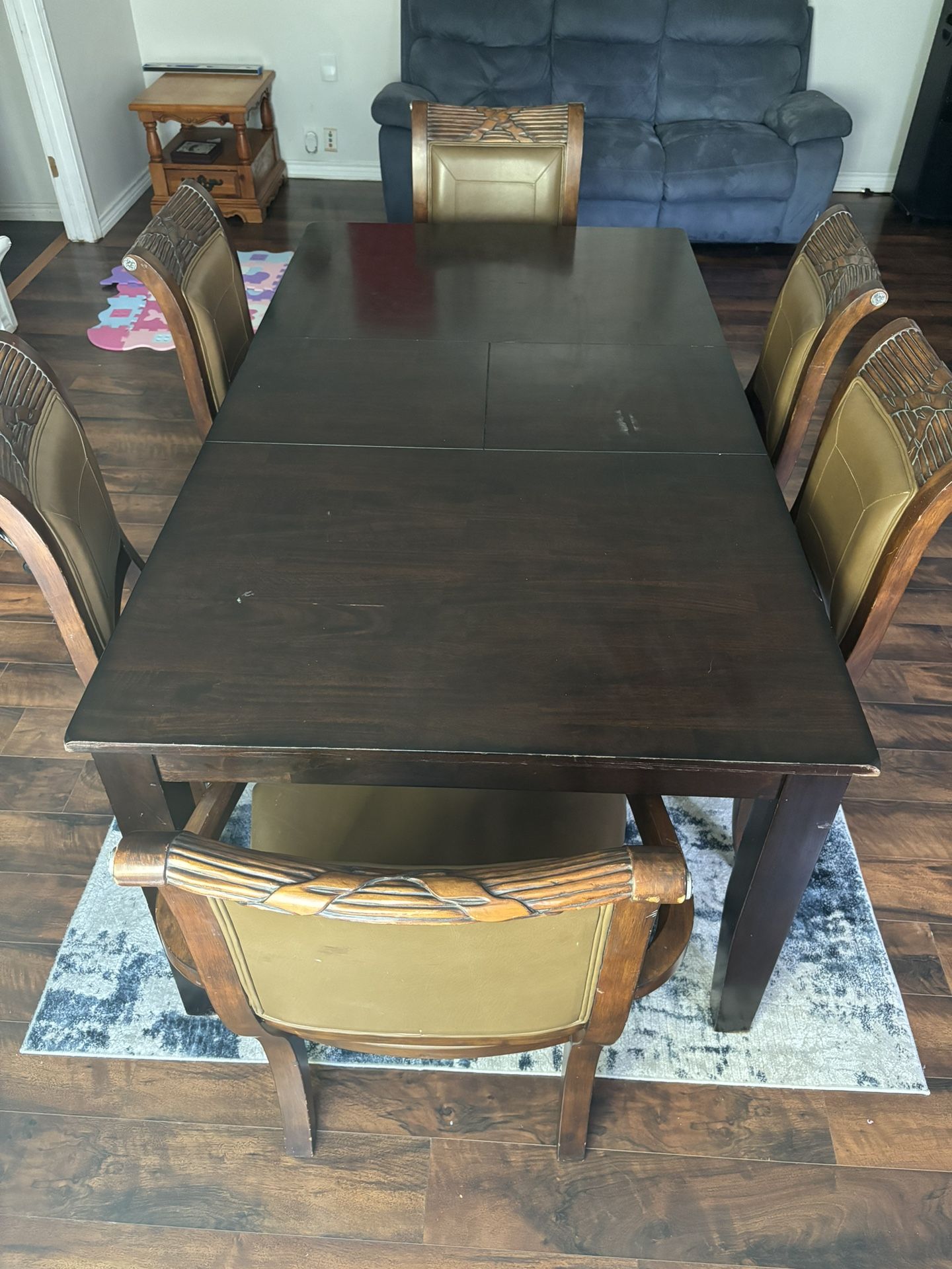 Extended dining room table and 6 chairs. Used but good condition. Nothing wrong with it. Just needing to make space for my new set.