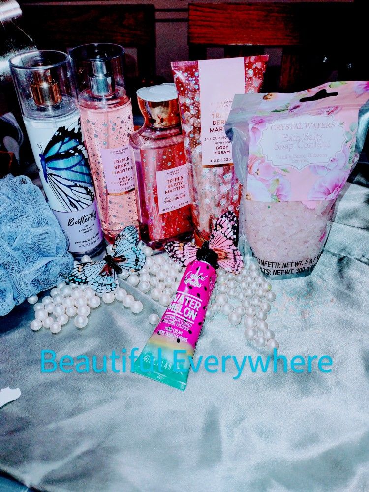 Bath & Body Works Bundle=7 Triple Berry Martni Body Spray Body Cream Body Wash Body Spray- Butterflies Body Scrubber BATH Beads ** Free WATERMELON Hand Lotion**""
