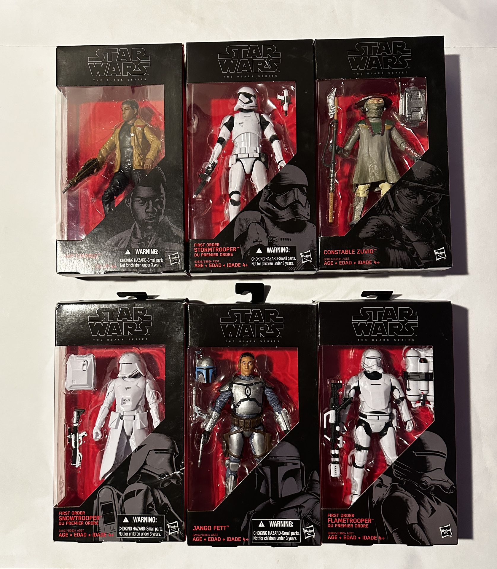 Star Wars Black Series! Ranging from $10-$40 Each New in boxes. Good to great condition. Prices based off previously sold on eBay and auctions. Willing to take offers. Thanks again! 01: Finn Jakku 10 04: First Order Stormtrooper 15 09: Constable Zuvio 10 12: First Order Snow Trooper 15 15: Jango Fett 40 16: Flame Trooper 20 22: Sgt. Jyn Erso 10 23: Captain Cassian Andor 10 26: Kyle Ren 15 27: Director Krennic 10 30: Princess Leia Organa 20 31: At At Driver 15 38: Royal Guard 20 39: Lando Carlissian 15 44: Rey Jedi Training 15 46: Luke Skywalker 15 50: Elite Praetorian 20 51: Finn First Order 10 52: General Leia Organa 10 53: Captain Poe Dameron 10 55: Resistant Tech Rose 10 59: Clone Captain Rex 30 62: Han Solo 10 60: Death Star Trooper 20 64: Range Trooper 15 66: Qi’ra 10 81: Padme Amidala 20 Imperial Jumptrooper 20 Varmik pop 7