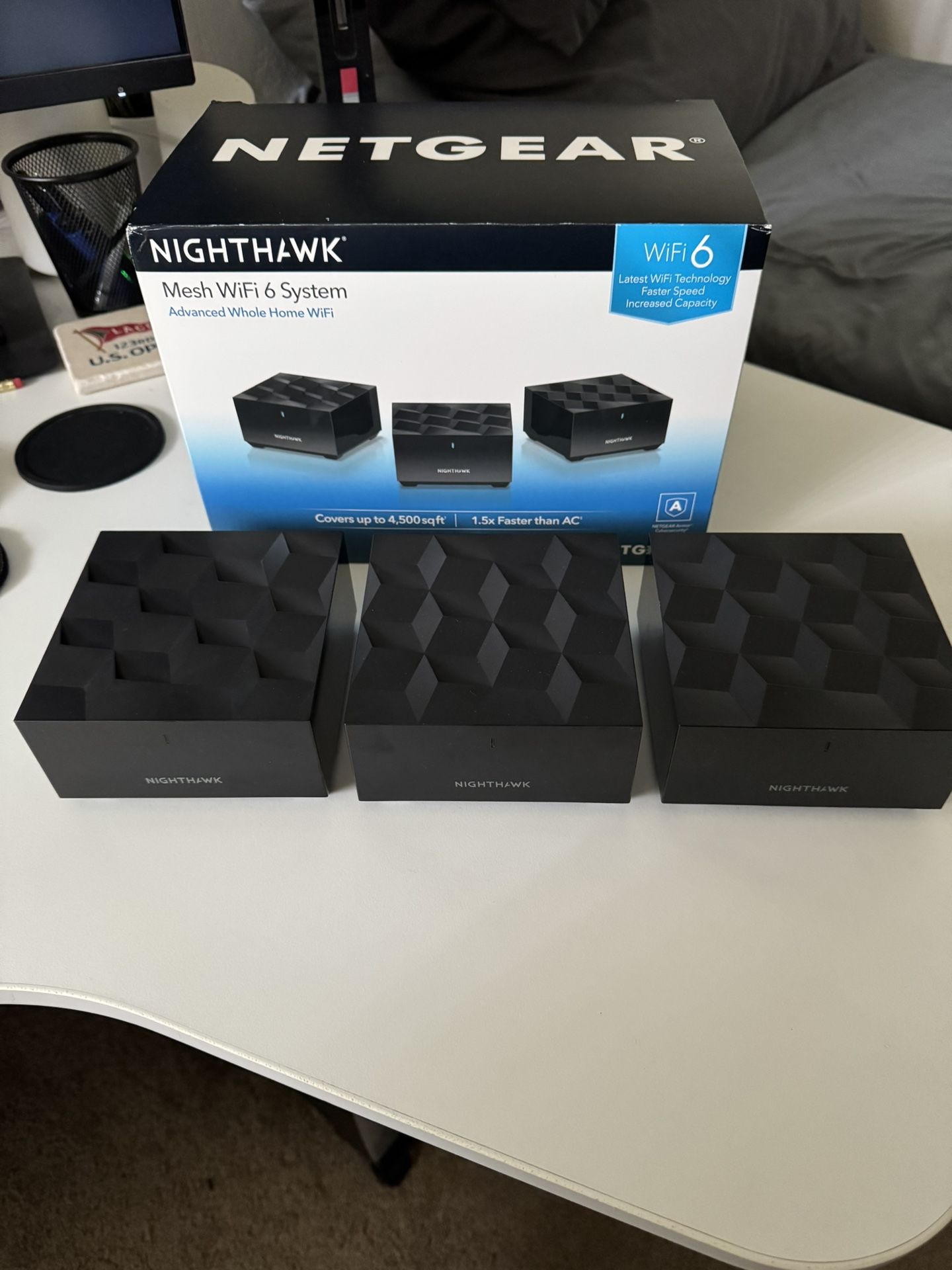 NETGEAR NIGHTHAWK WIFI 6 ROUTER with SATELLITES Excellent condition. Works perfectly. Original box included. Only selling because our new service gave us a router. Smoke free, pet free home.