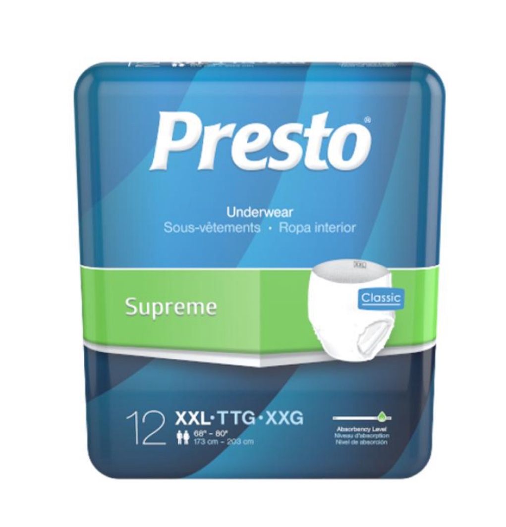 Presto - Unisex Supreme Classic Underwear Size XXL “68-80” Currently have 10 boxes with 4 packs in each box 1 pack = 12 underwear 4 pack = 48 underwear Selling 1 pack for $10 Selling box of 4 packs for $30