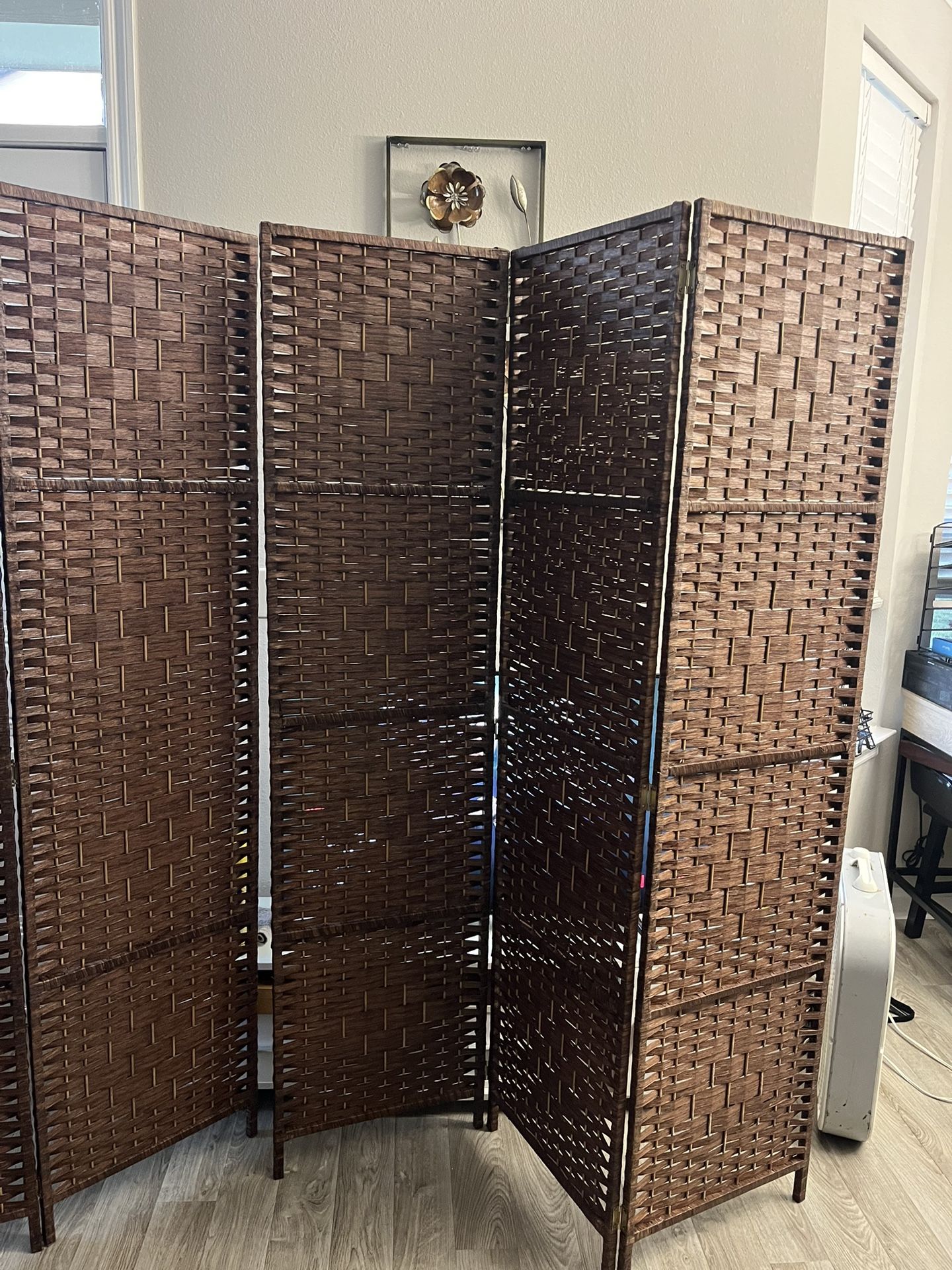Maximum privacy and coverage! I'm selling an extra-wide 6-panel room divider in excellent condition. Perfect for dividing large rooms, creating a private home office, or concealing storage areas. • Capacity: 6 hinged panels (covers much more than standard dividers). • Material: Durable woven fiber with a reinforced frame. • Color: Dark Brown / Chocolate. • Versatility: Can be folded in a "Z" or "W" shape to fit your space. Folds completely flat for easy storage.