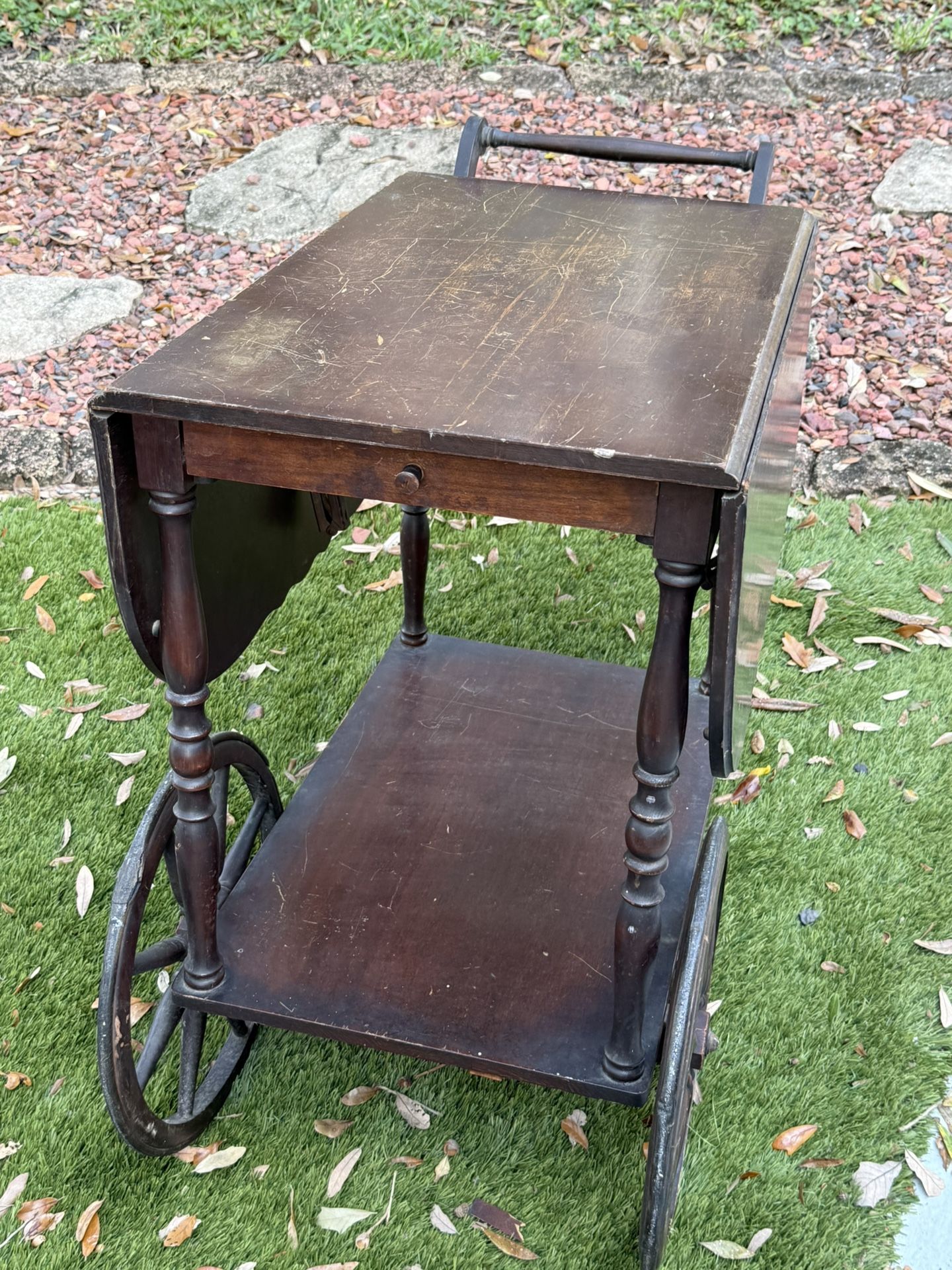 Early 19th century bar / tea cart See pictures for condition Missing back legs Dated June 9th, 1925 25”X15” folded down 28” tall
