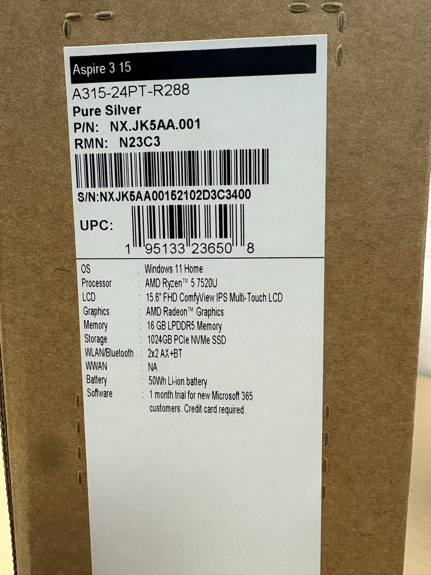 Brand new in the box - Acer Aspire 3 15” AMD Ryzen 5 7520U 16GB RAM 1TB I got this as a gift, I have a Mac and don’t need it, my loss you’re gain Retail $599 not including taxes, Selling for $475 OBO Willing to trade for meta glasses