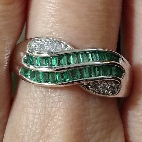 Up for sale is this very beautiful new stamped 925 solid sterling silver ring SIZE 8 with gorgeous baguette style stones set into the band with beautiful lab-created green π Sapphires and white π€ Sapphires in kind of a criss-cross pattern. It's very beautiful in person! From our smoke-free home. Pictures shown in different types of lighting.