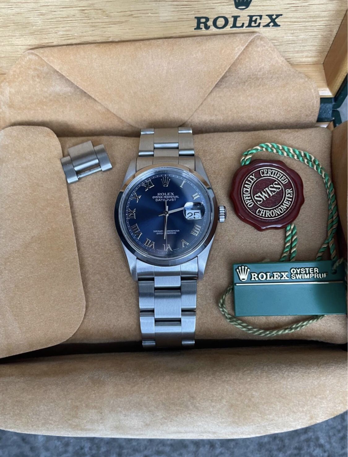 Just in time for the holidays! Factory authentic Mint 1997 Datejust 36mm. Ref. 16200 Blue Roman numeral dial, oyster bracelet with 11 links, outer+inner box/tags/manuals/etc and eBay authentication card included. Recently polished and serviced here in Frisco Texas. Insured shipping to any location nationwide ✈️ I accept cash, Zelle, cashapp, ApplePay, bank wire.