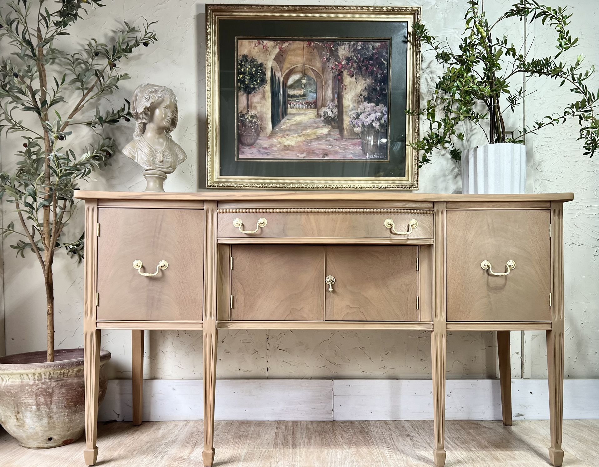 Gorgeous fully restored vintage buffet or Credenza. This piece is made of solid mahogany wood and has been sanded down to its original color and tan washed to create a beautiful light tone finish. It’s been triple sealed in water based polyurethane using a spray gun for a smooth, flawless finish. It’s lined in designer wallpaper and features original vintage hardware. The drawer slides excellent and cabinets open and close as they should. This piece could be used as a buffet, sideboard, credenza, entryway storage, bathroom, nursery, tv stand ect. Dimensions: 68” W 22” D (widest middle part) 38” H -About my work- I’ve been perfecting my craft of refinishing high quality, solid wood furniture for 10 years. I pride my work on attention to detail and providing excellent and smooth paint and stain finishes, sealed with polyurethane or lacquer. I use only non toxic, high quality products. If you have a piece you’d like refinished, Please reach out😊 I accept cash or Venmo and require a deposit to hold an item, otherwise first come first serve! All pieces are in great vintage condition and sold as is. Sales are final. *restoration hardware, Anthropologie, arhaus, lulu and Georgia, west elm, pottery barn, CB2, rejuvenation, room and board, vintage, antique, primitive