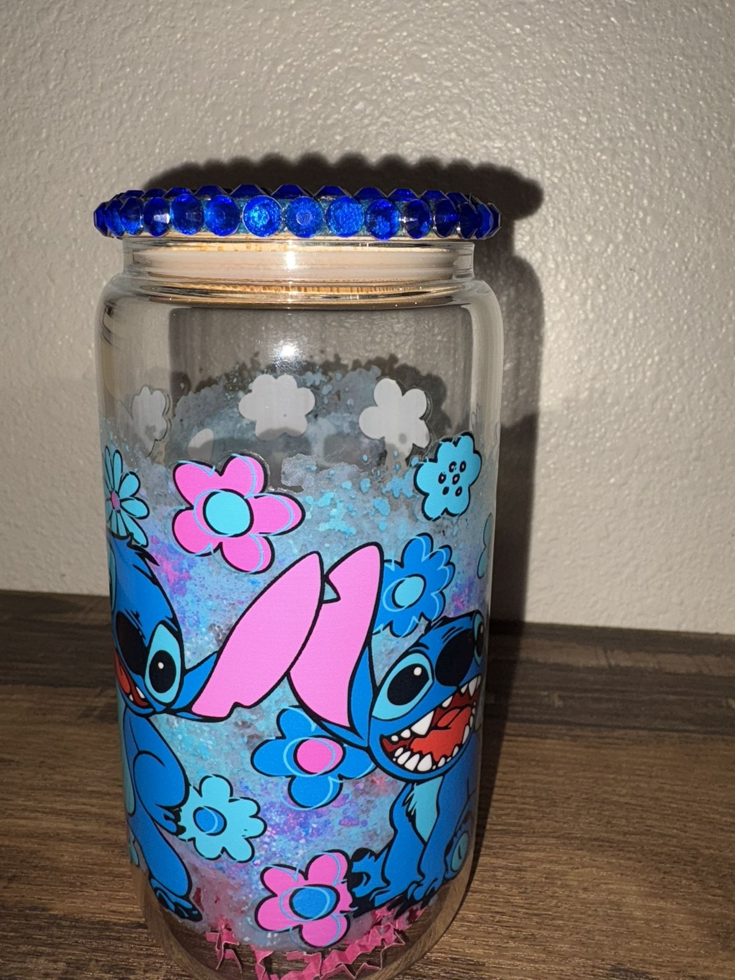 Whoever is a Stitch lover come and get this Glass tumbler cup π!!!! This one does come with rhinestones so it will cost more .