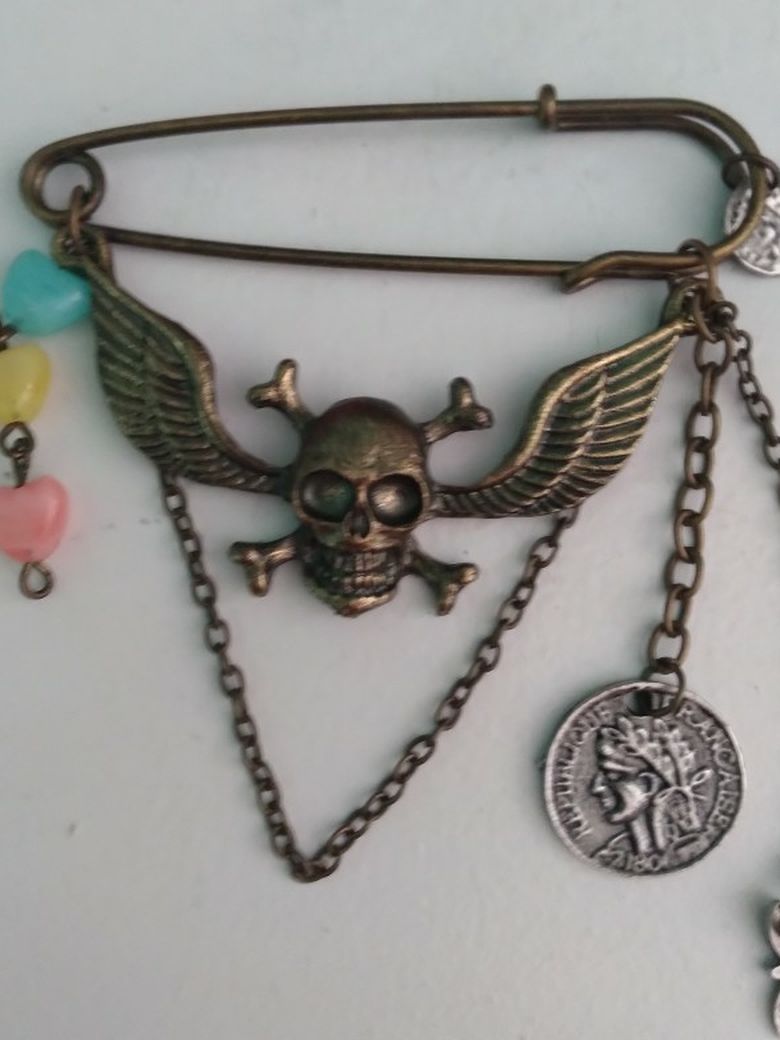 Have not been able to find anything like this anywhere. Has two French coin replicas a skull and crossbones with wings and three stone hearts attached to an antique type pin. The word a.namu is stamped on a separate piece which is the name of an herbal drug used to treat cancer. Very cool looking piece for a reasonable price.