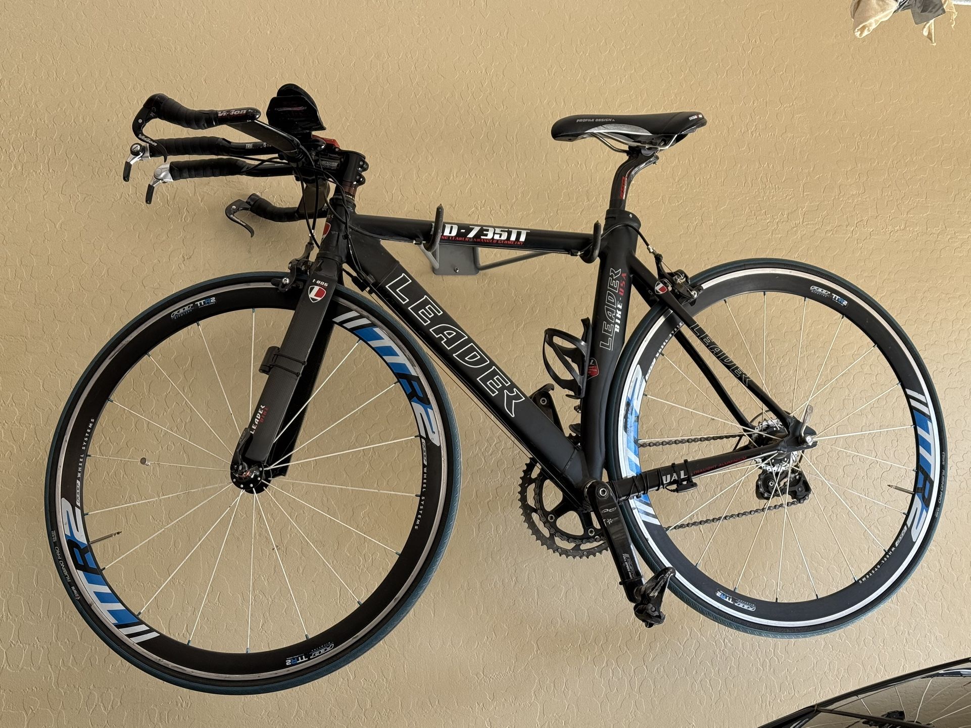 Leader 54 cm time trial bike. My wife is 5’4” & we had it adjusted down for her. Good for someone up to 5’9”. Very light fast bike. Used by my wife for triathlon. FS2 cranks, Shimano Ultegra components , Felt TTY2 carbon fiber rims, Carbon fiber seat post $400