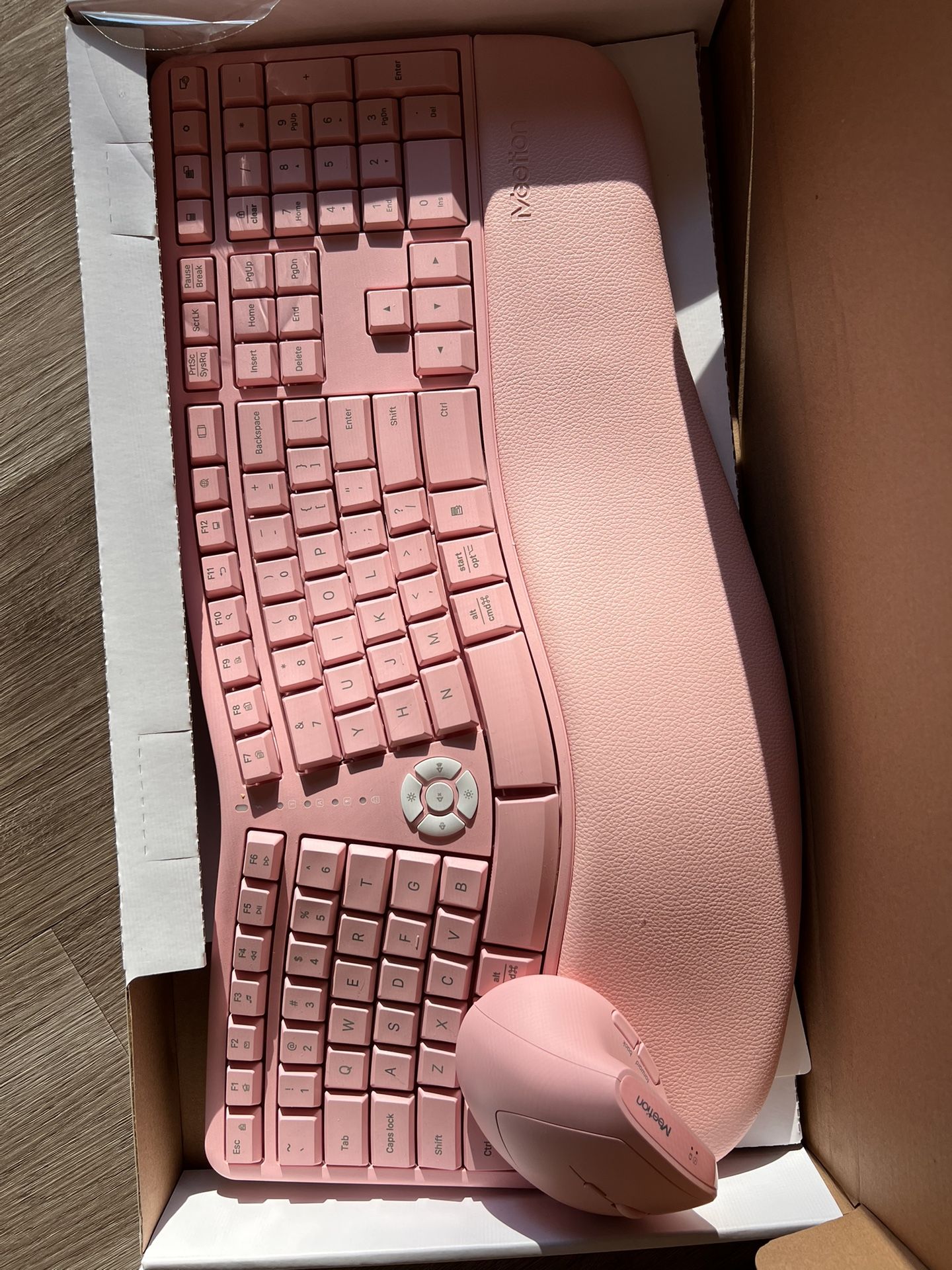 Pink ergonomic wireless keyboard and mouse. Keyboard has a wrist pad. Perfect condition. Only used a few times before going back to my old setup.