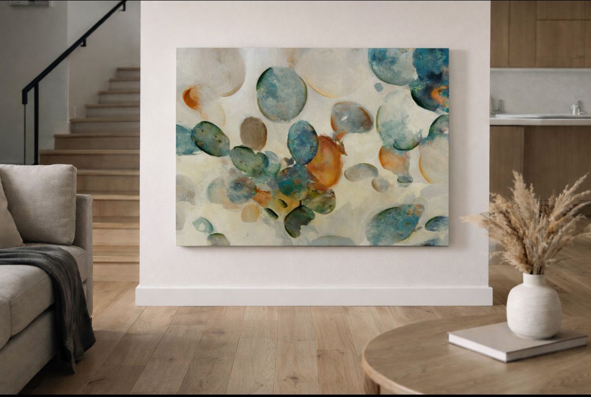 Elevate your space with this stunning oversized abstract canvas featuring layered organic forms in rich teal, deep blue, earthy green, and warm amber tones. The soft, neutral background allows the vibrant, fluid shapes to float effortlessly—creating a calming yet sophisticated focal point. This piece has a high-end, designer look that pairs beautifully with modern, transitional, and contemporary interiors. The dimensional color blending and subtle texture details give it depth and movement, making it feel both serene and luxurious. Perfect for: • Living rooms above a console or sofa • Entryways for an impactful first impression • Offices or creative spaces • Dining rooms or open-concept homes