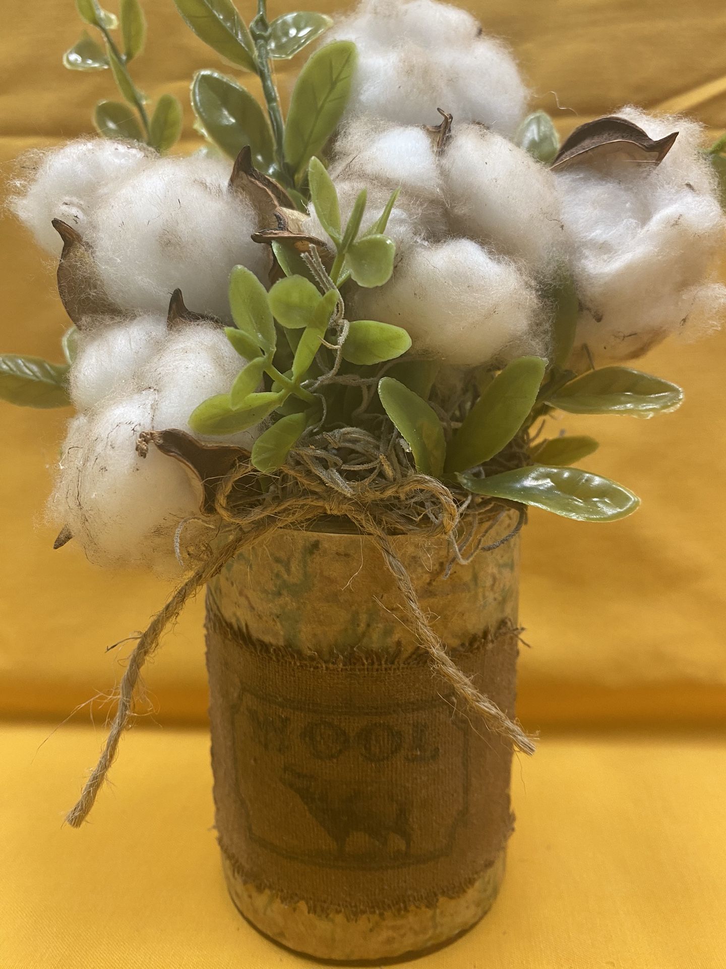 Decoupaged tin can with cloth patch on front that says “wool” and has cotton balls with moss and jute bowl. Measurements are 6 inches wide and 11 inches tall.