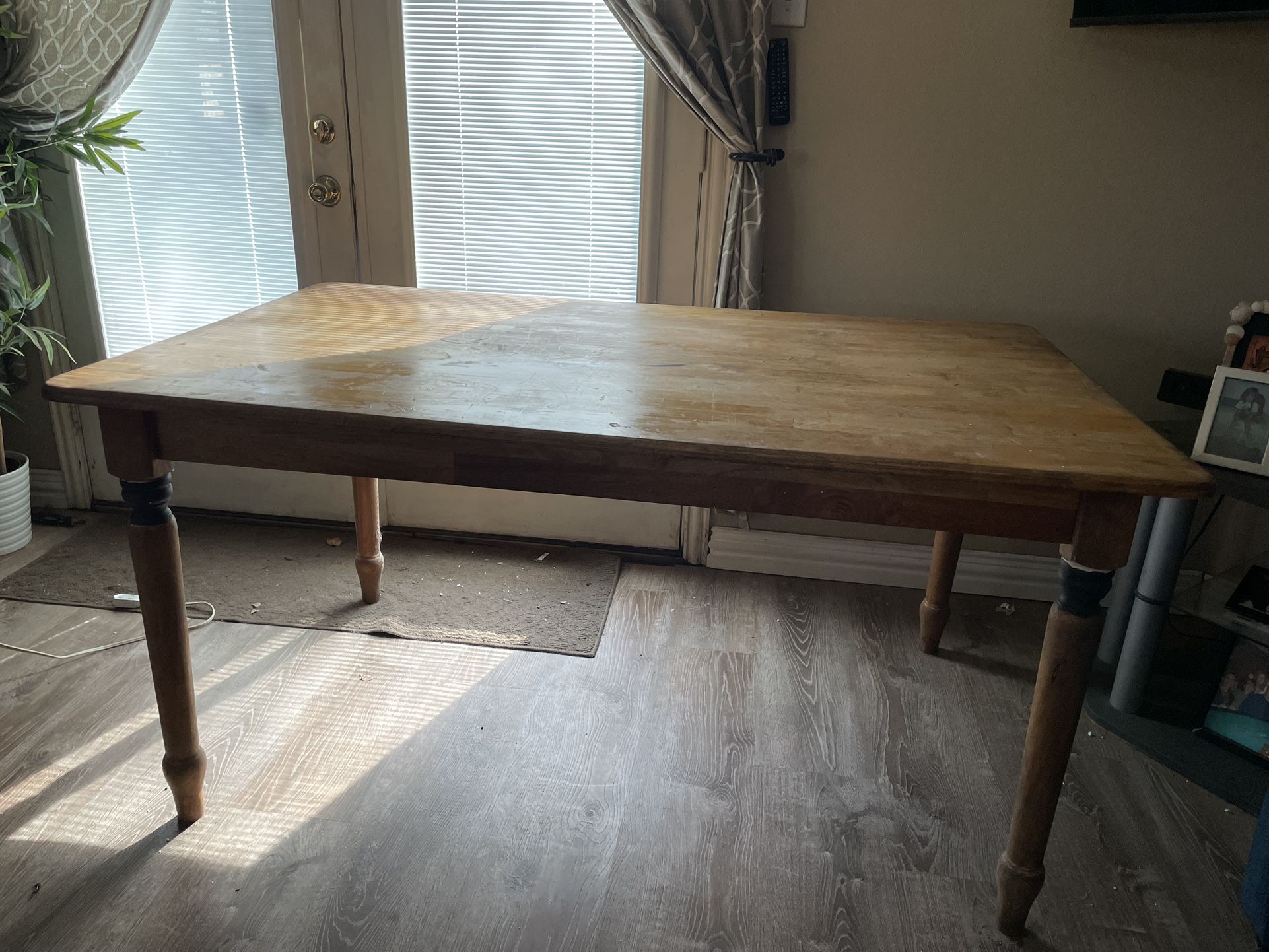 Awesome, wood dining table with drawers on each side comfortably fits a family of six I do have two chairs that I’ll throw in