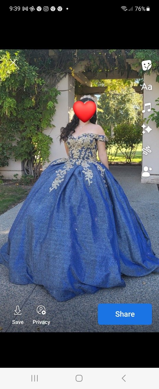 Beautiful quinceañera dress in a Navy blue with a glittering shimmer look to it. It's an XXL but fits like a Large because it has a corset on the back. Comes with accessories, too.