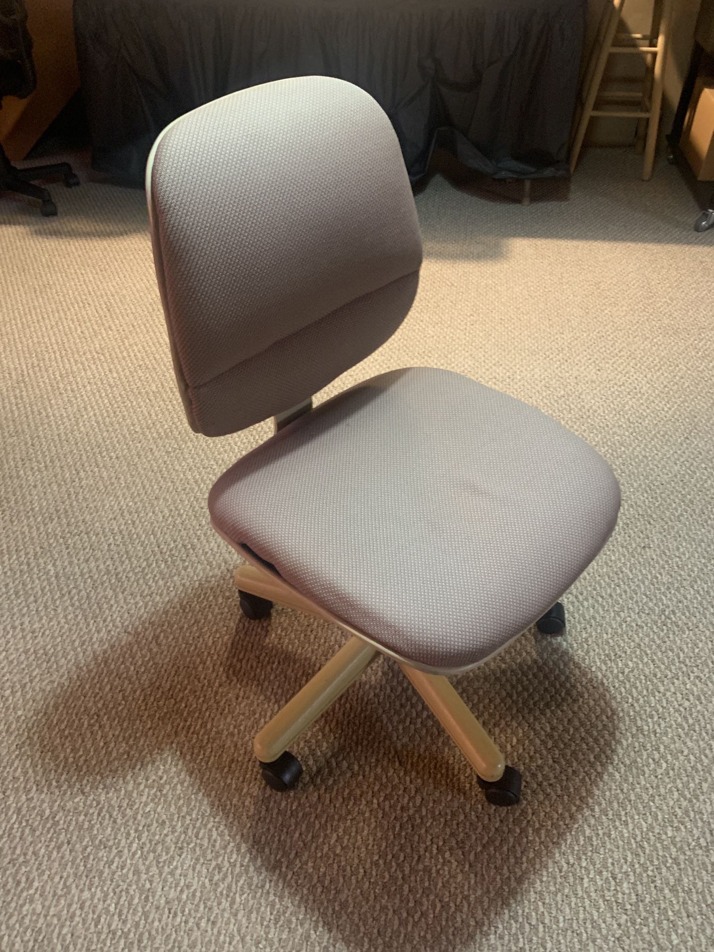 Wheeled basic office chair. Padded with beige cloth covering. Adjustable height and swivel base. Cash only, sold as is.