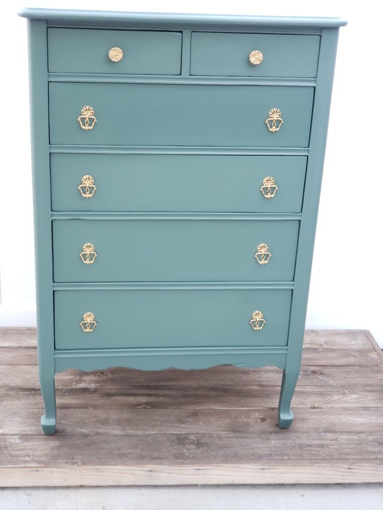 Teal/ blue Green tallboy cheat of drawer 6 drawer Vintage D 18 1/2" W 30 1/2" H 45 3/4" The piece has character marks and minor imperfections consistent with its age and refinishing process. All drawers pull out smoothly.
