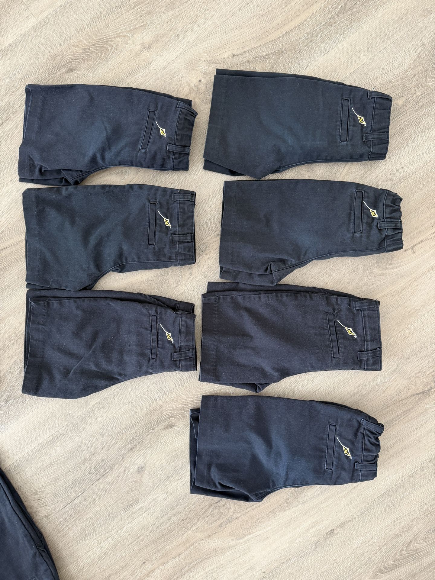 items available Shorts 5, size 5 shorts ($8 each) 1, size 5 pants new with tags($20) 4, size 6 shorts ($8 each) Pants 5 SIZE 5 pants ($10 each) PE 2 size SMALL sweatpants ($8 each) 1 S sweat pant (free - the sweat pant has a small rip on the knee). Shirt 1 XS blue polo shirt ($8)