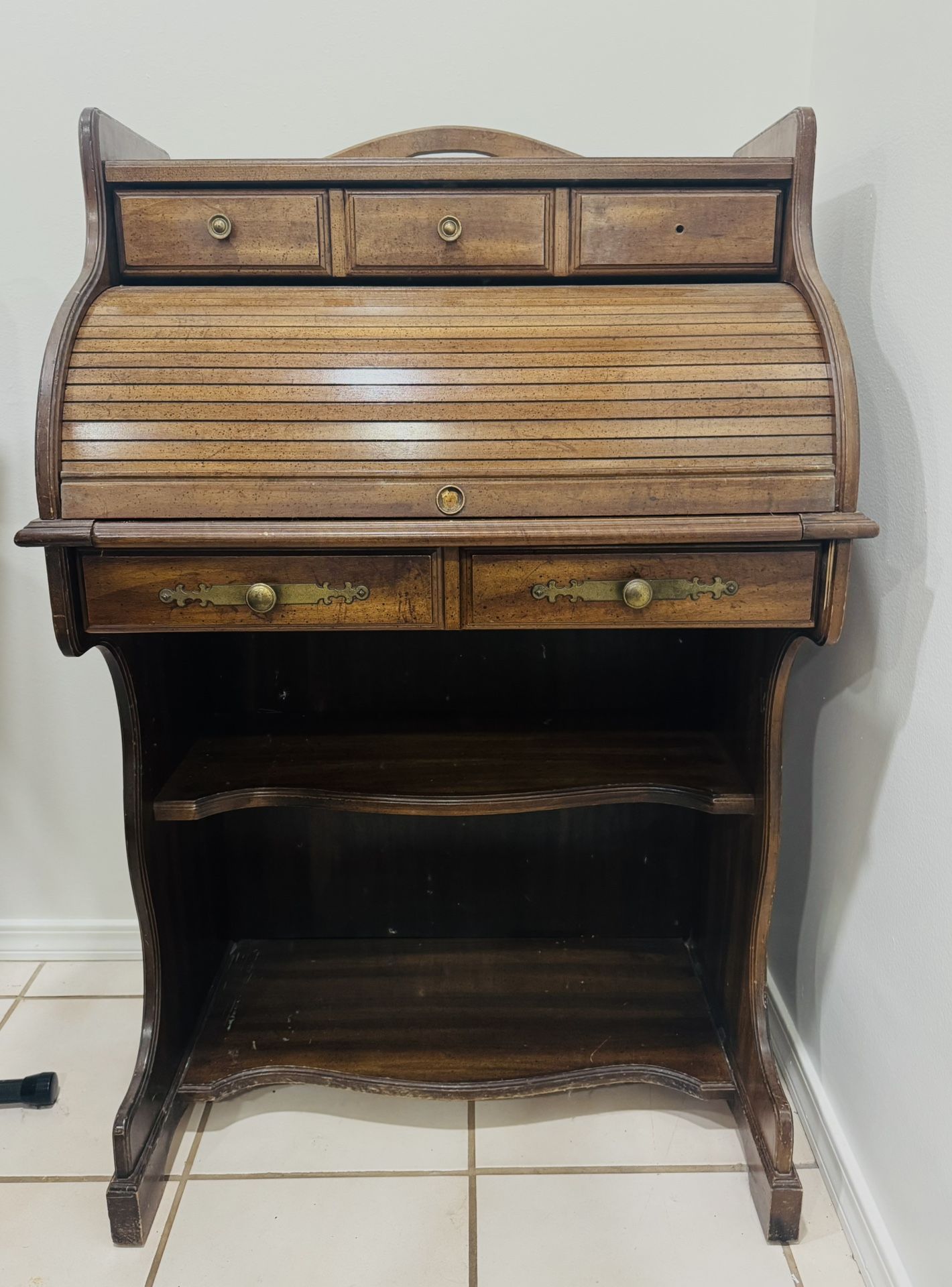 Vintage roll top desk. 26”L x 41”H x 16.75”D Some scratches, 1 missing knob Beautiful vintage and functional. Roll top works well, extended table top. 2 functioning drawers.