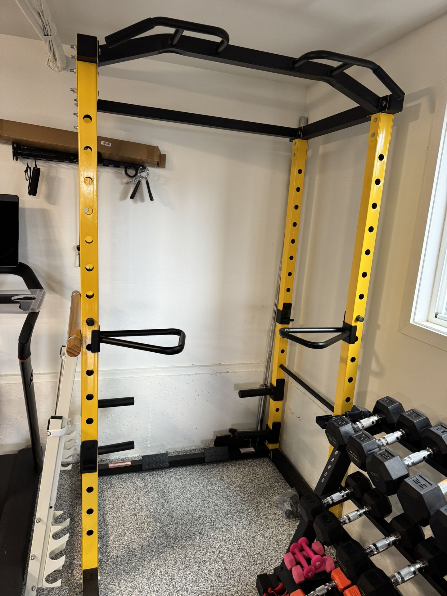 Weightlifting power cage. Pull up handles, dip attachments, plate holders and landline attachment included.