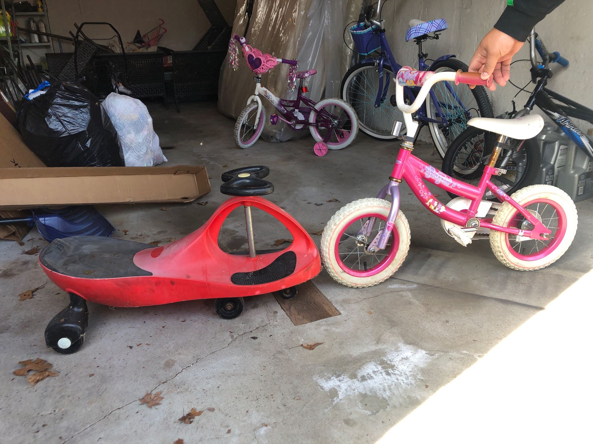 Toddler princes bike and red wheeled toy Bike works perfectly but the handles are showing some rust with a good cleaning it will be like new asking for 10 dollars Red wheeled car/toy perfect condition just need cleaning it’s been stored in old garage. Asking 10 dollars