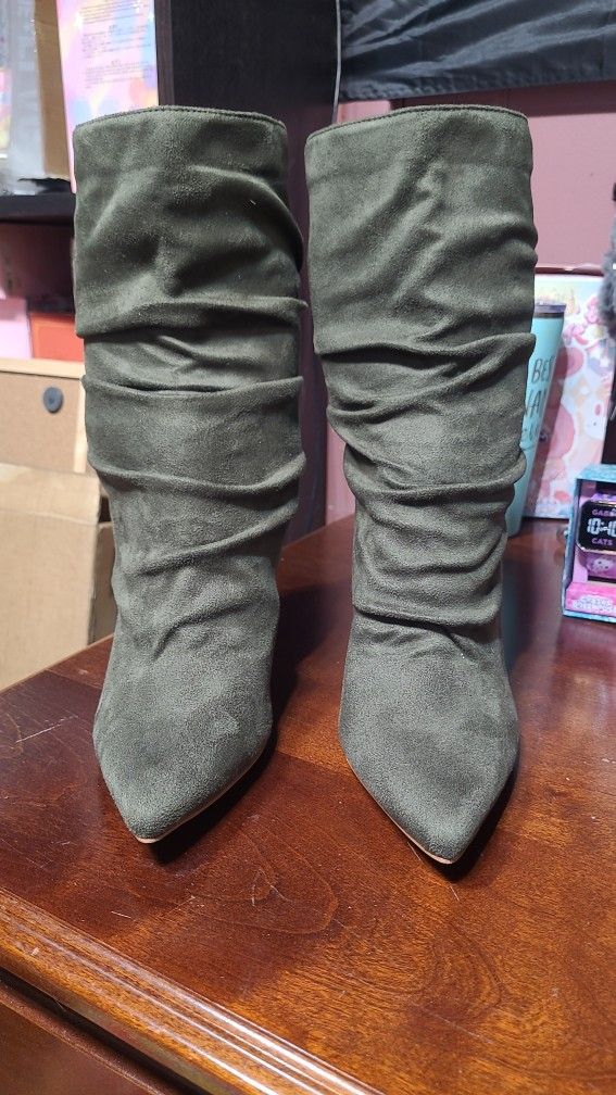 Sz 11 Olive Green Faux Suede High Heel Boots